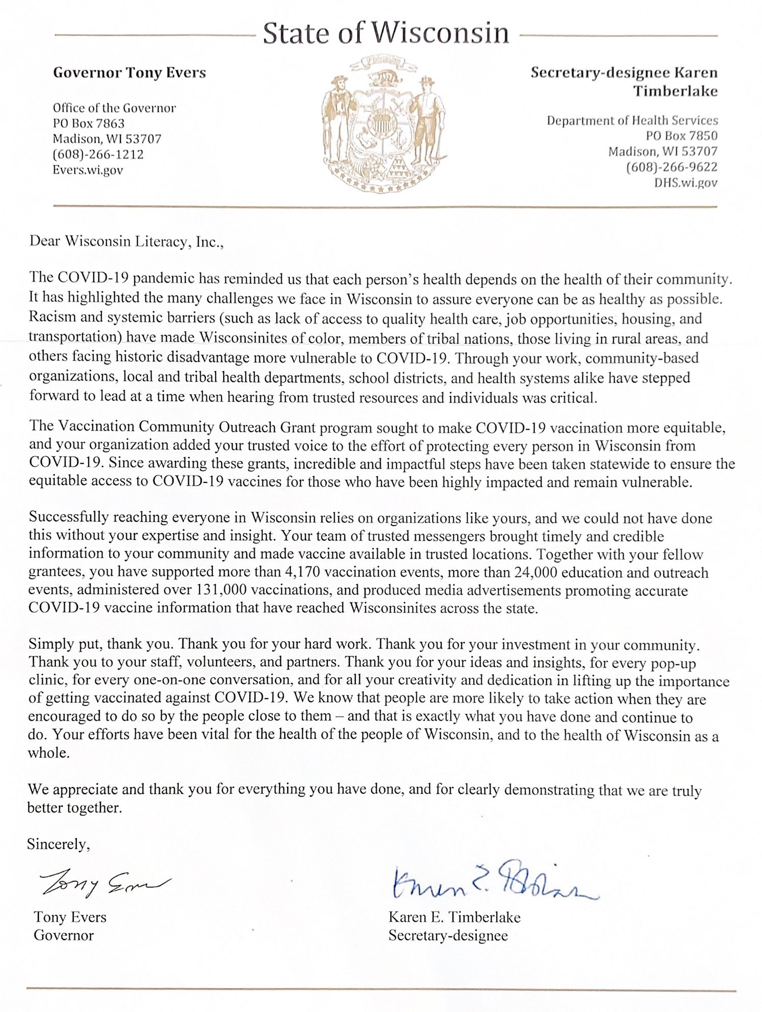 We are very grateful for the support of the Wisconsin Department of Health Services and for the recognition from Governor Evers. Our member agencies and countless other non-profits and public health workers across Wisconsin are working together to make vaccinations and health care more equitable.